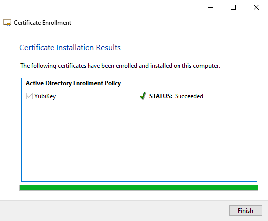 - Windows enrolls the YubiKey for Windows login. The process may take several seconds, depending on the network connection to the server running the Certification Authority. Once completed, click Finish.