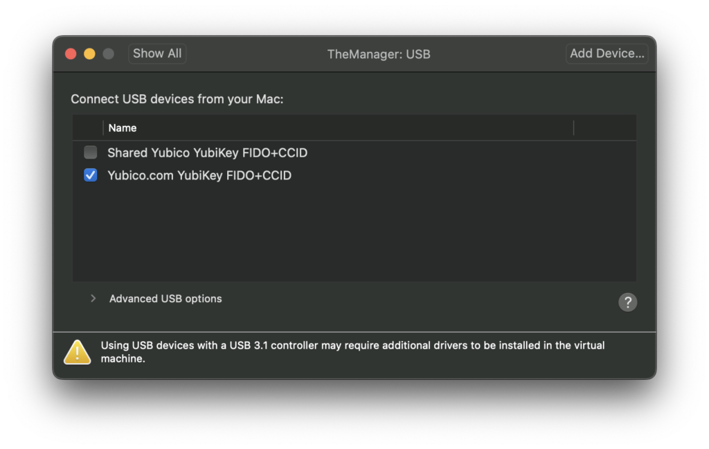 I have a Microsoft Windows virtual machine that I log into (a jump host) since my primary computer is a MacBook Pro. Unfortunately, the Microsoft Remote Desktop App on macOS does not pass the PIV credentials. When I log into the jump host, I attach the Yubico.com YubiKey FIDO+CCID device to the virtual machine. The Shared device will not be recognized by the YubiKey Manager. Attaching the non-shared device to the virtual machine will remove it from the host!