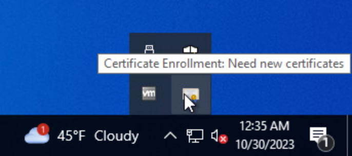 - Click the Certificate Enrollment notification to open the Certificate Enrollment wizard. If the popup has disappeared (or didn’t initially appear) click the arrow in the System Tray to expand the list of options and click on the certificate icon.