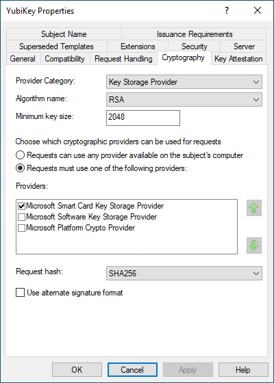 - If you are not prompted for a PIN, and the process completes successfully, double-check that you selected Microsoft Smart Card Key Storage Provider under Providers in your template’s Cryptography tab. If a setting on your template needs to be changed, it is recommended to delete it and create a new one with a unique name, to ensure that the changes made take effect.