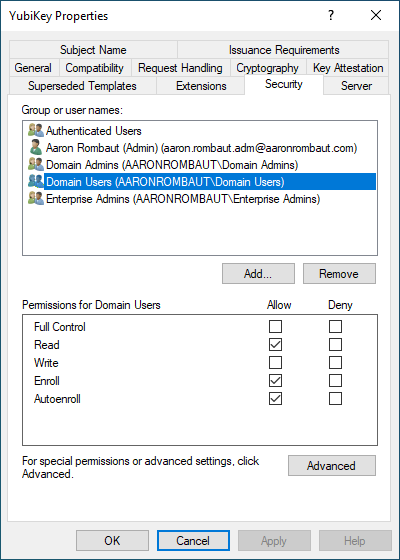 - Permissions for [group name]: If users will be auto-enrolling using the built-in Windows functionality, ensure the options are checked for Read, Enroll, and Autoenroll.