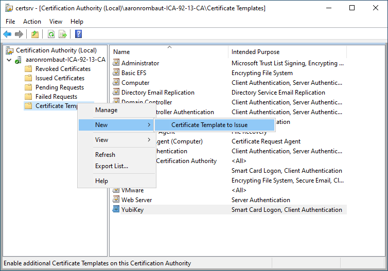 Back on the Certification Authority window, right-click Certificate Templates, point to New, and select Certificate Template to Issue.