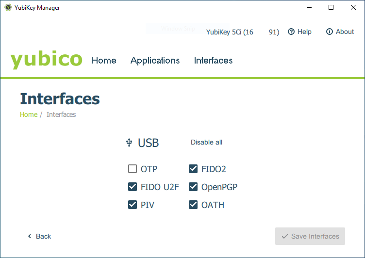 On my jump host, I have a utility installed called YubiKey Manager, downloaded from https://www.yubico.com/support/download/. This is a graphical utility that allows me to configure various Applications and Interfaces on my YubiKey.