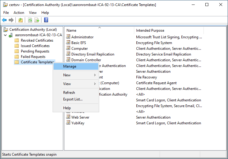 On the Certificate Authority (CA) server used to issue certificates, open Certification Authority (certsrv.msc). Expand the tree, right-click on Certificate Templates, and select Manage.