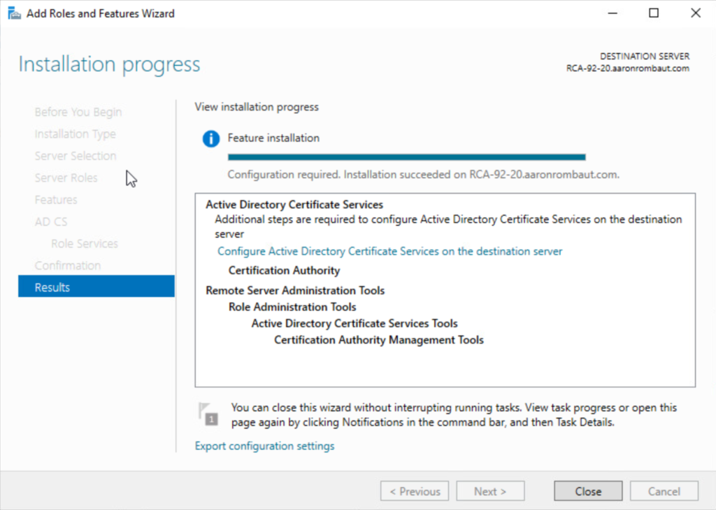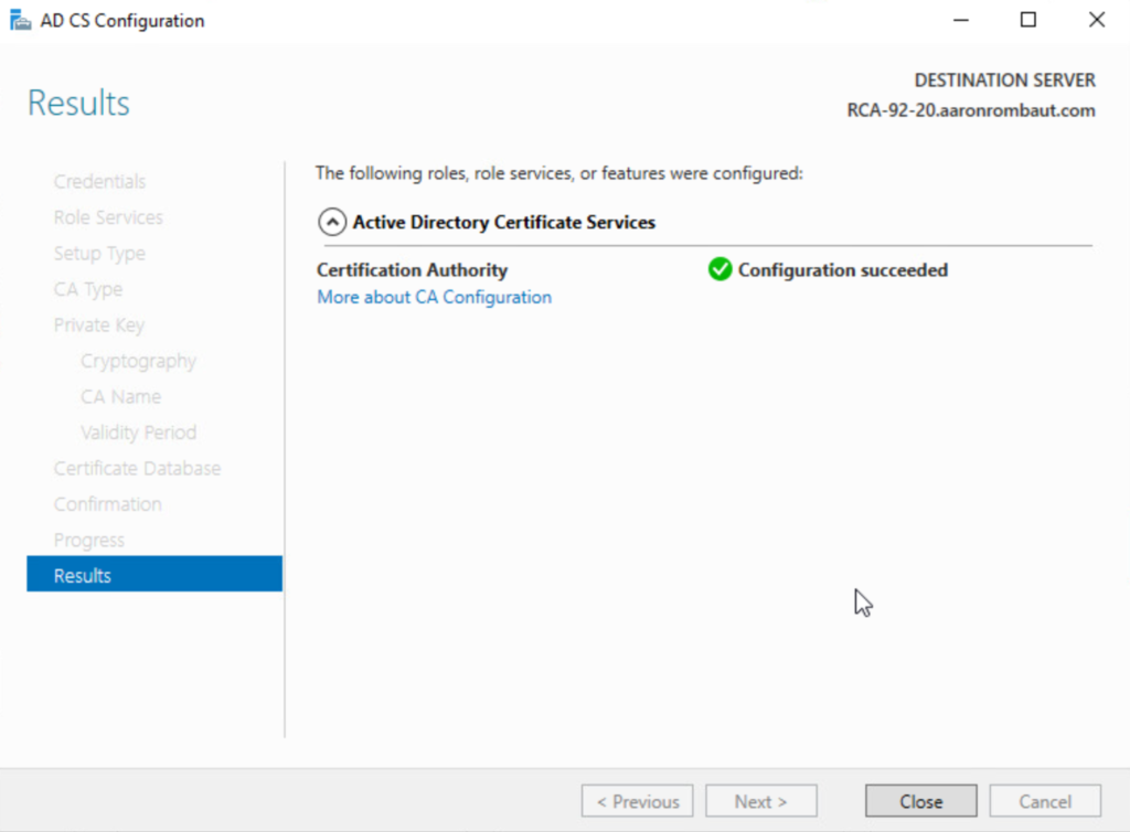 The Results window displays. This window can be closed and the intermediate certificate authority can be configured.