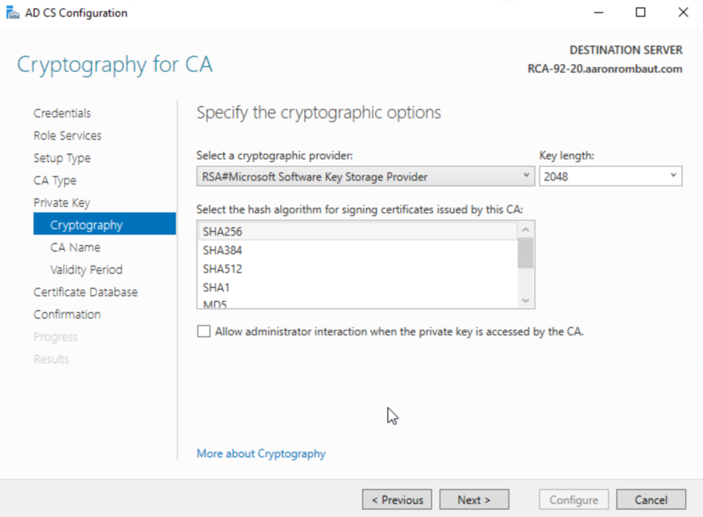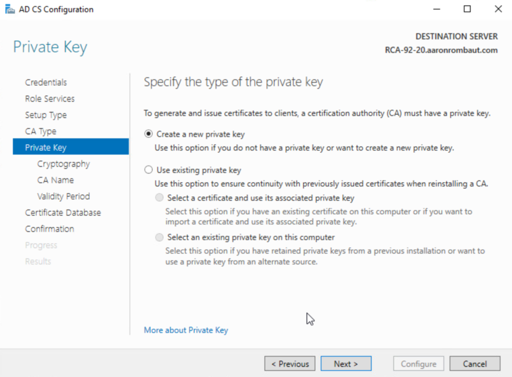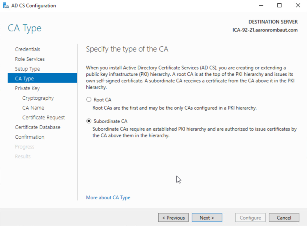 Most of the same as configuring the Root Certificate Authority will apply. This time we will choose Subordinate CA when asked for the CA Type.