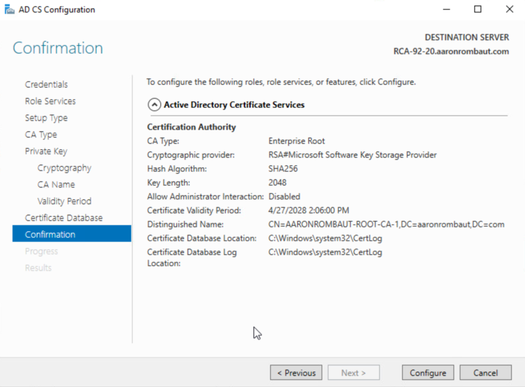 After the role is installed, click on Configure Active Directory Certificate Services on the destination server.