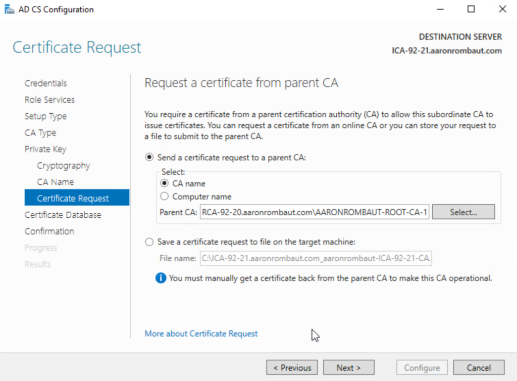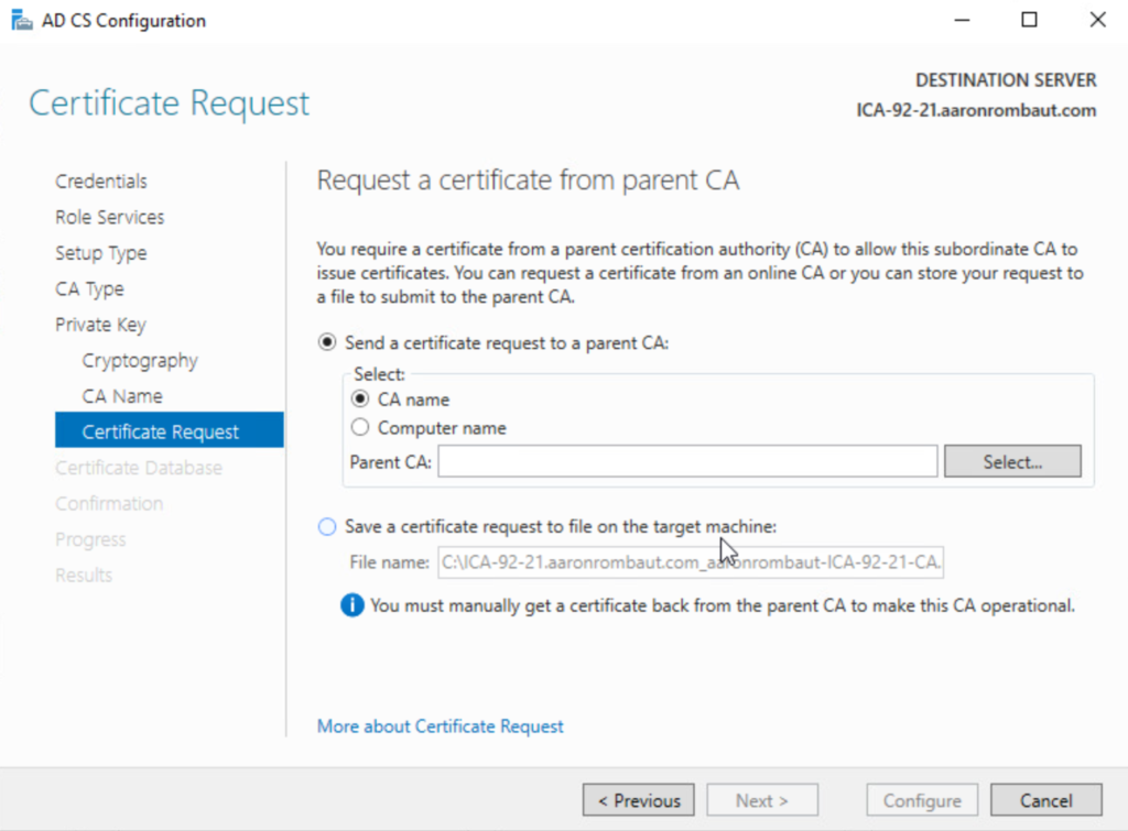 The Intermediate CA still needs to be trusted (signed) by the Root CA. For this to happen, choose Send a certificate request to a parent CA:, choose CA name, and click Select.