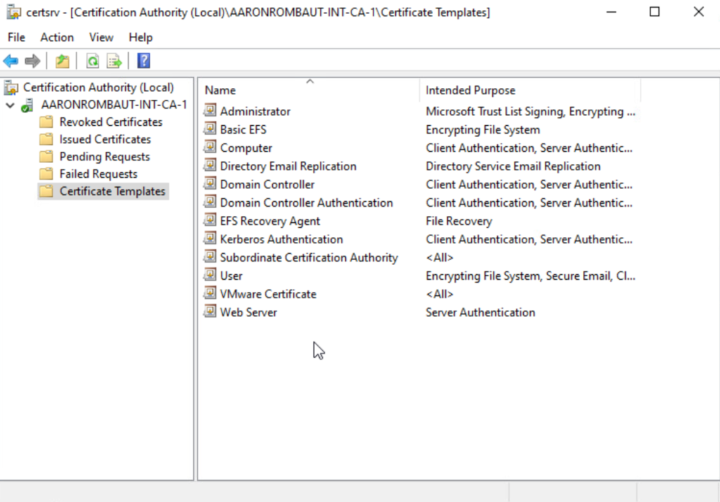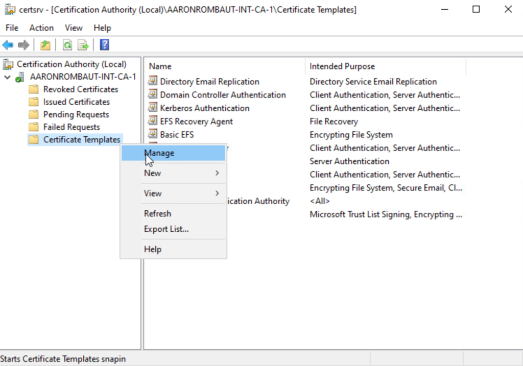 Open up the Local Certification Authority (certsrv.msc) and right-click Certificate Templates to Manage.