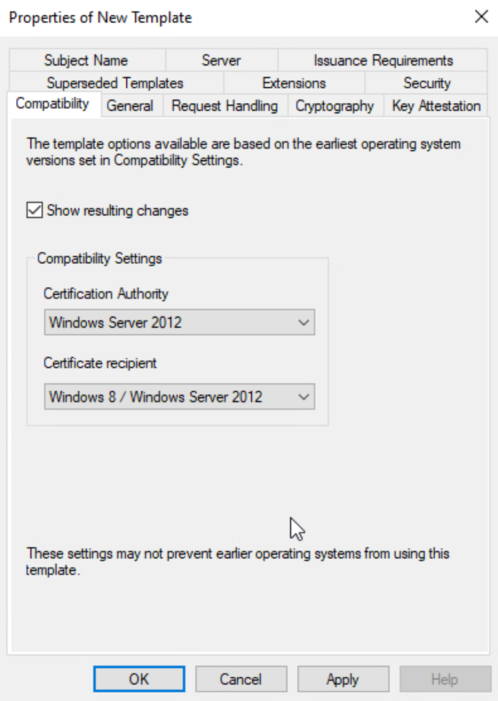 On the Properties of New Template window, on the Compatibility tab, configure the Compatibility Settings: