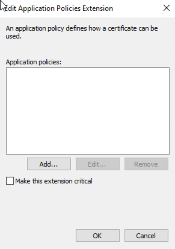 On the Extensions tab, Application Policies, remove the Client Authentication and Server Authentication policies, if they are present.