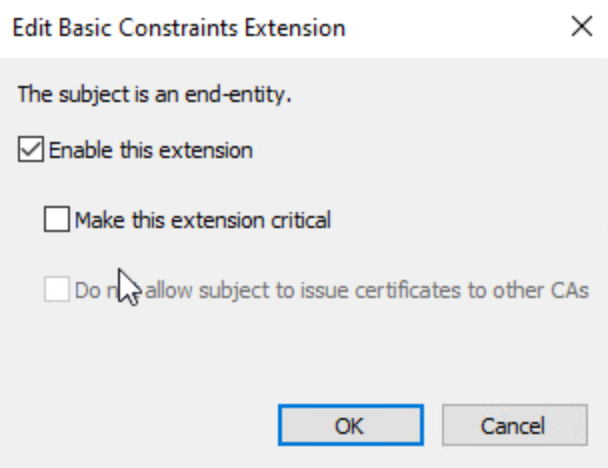 On the Extensions tab, Basic Constraints, edit and check Enable this extension.