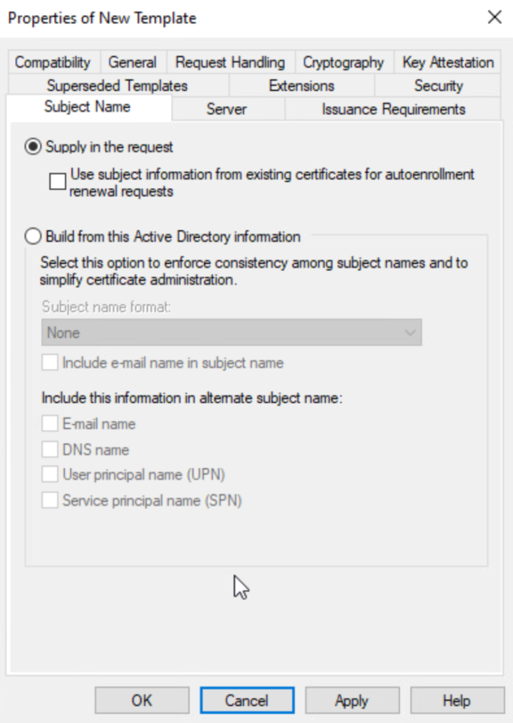 On the Subject Name tab, ensure the Supply in the request option is selected.