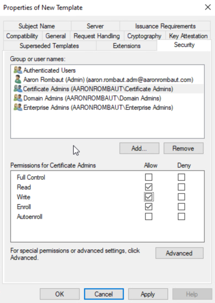 On the Security tab, add the Certificate Admins security group and make sure Read, Write, and Enroll permissions are checked.