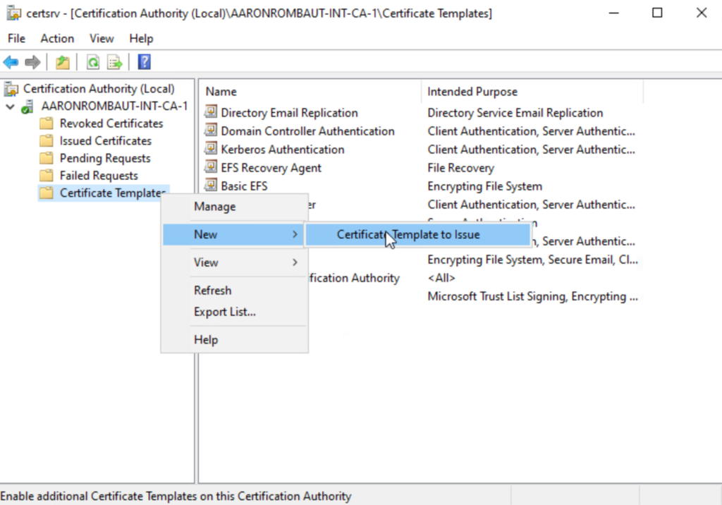 Open the Local Certification Authority (certsrv.msc) and right-click Certificate Templates. Click New and select Certificate Template to Issue.