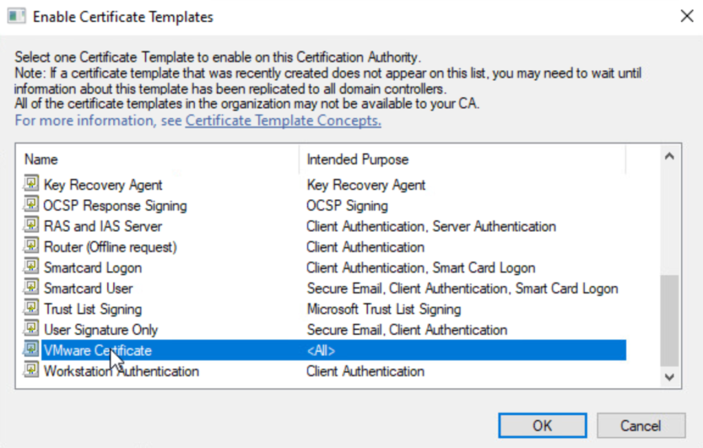 Choose the VMware Certificate (or whatever it was named) created earlier and click OK.