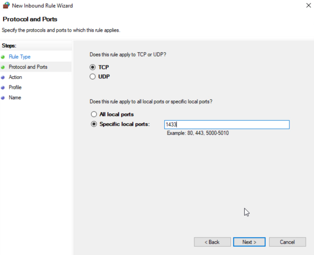 Leave the TCP option selected. Choose the Specific local ports: and type in 1433.