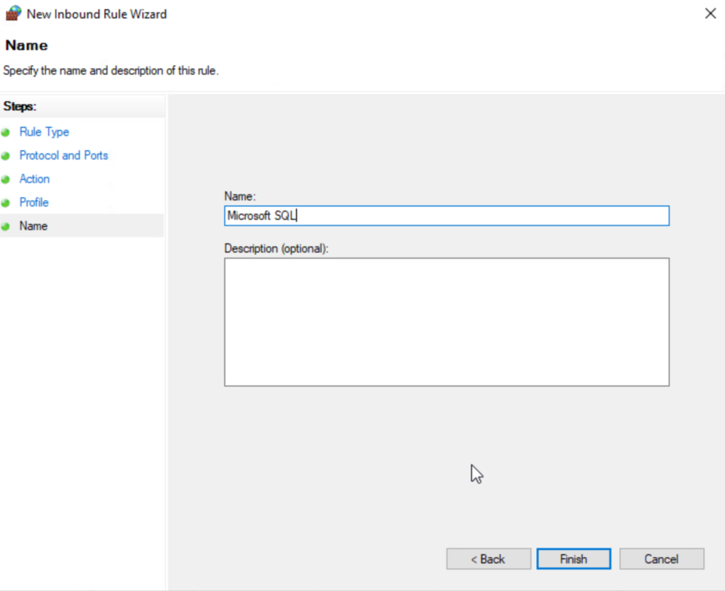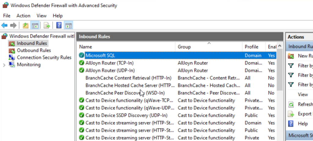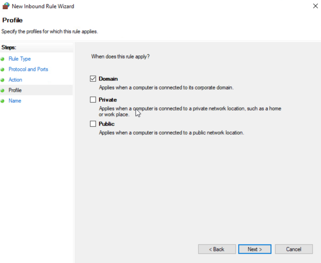 I generally uncheck the Private and Public profiles. I want to ensure that only Domain devices are allowed to communicate with the database server.