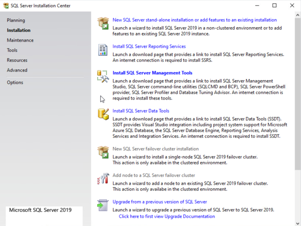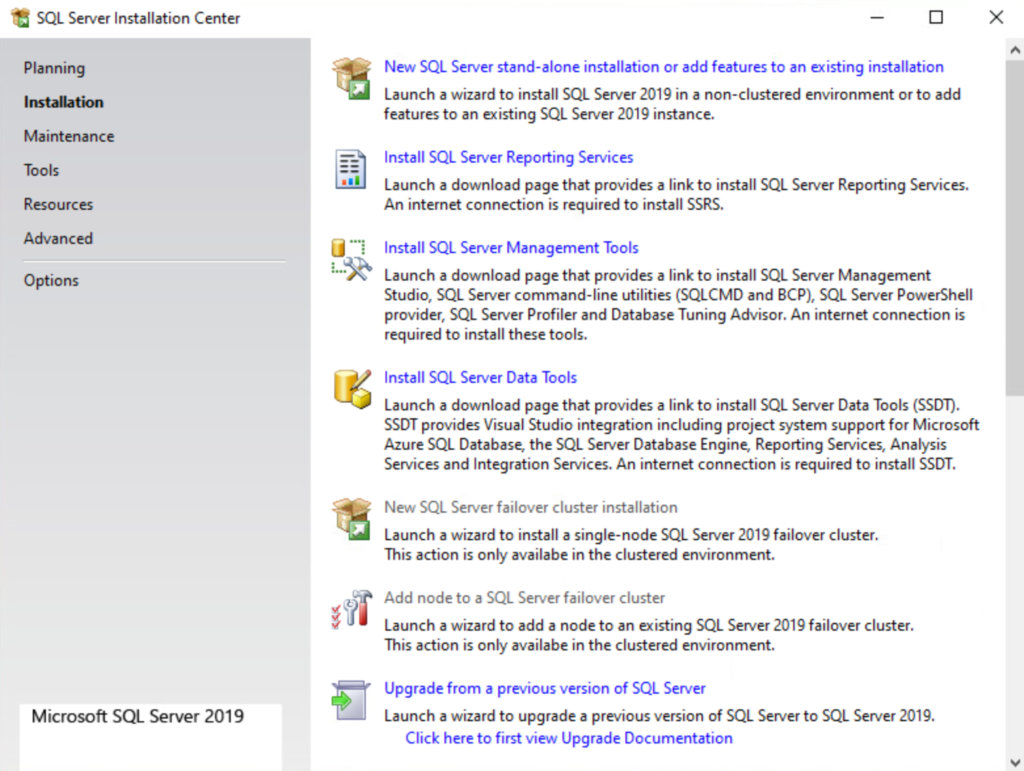 Choose Installation from the menu on the left and click New SQL Server stand-alone installation or add features to an existing installation.