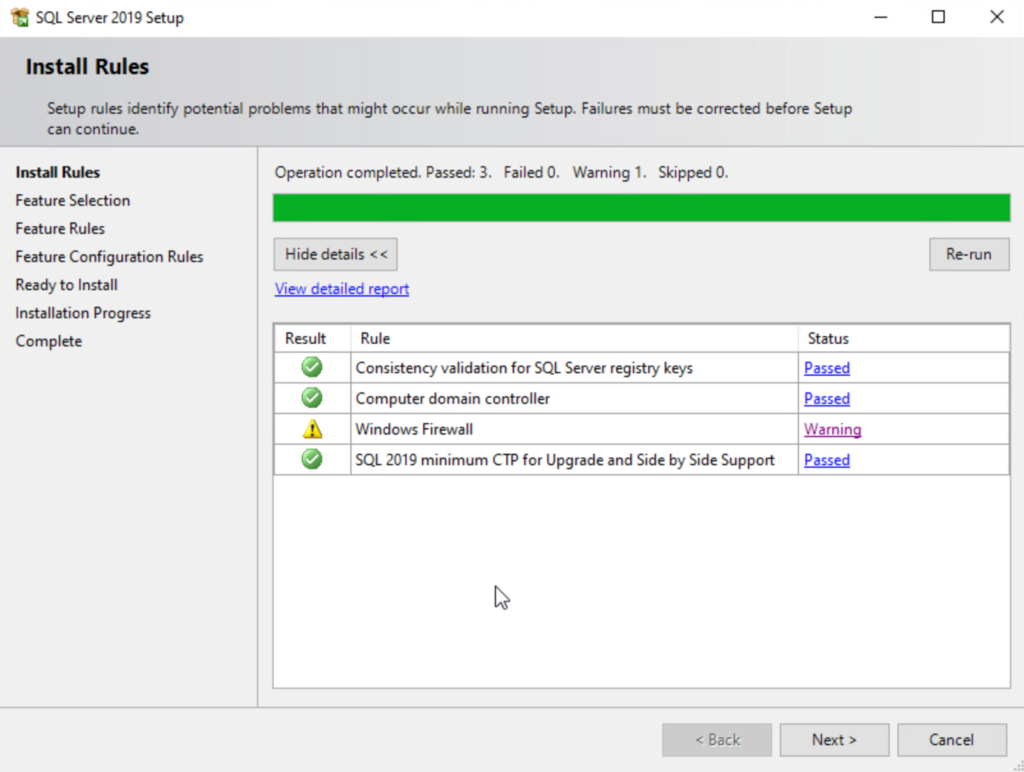 The installation will do a test and will likely report a Warning regarding the Windows Firewall. This can be safely disregarded as the rule can exist prior to installation or be configured after installation.
