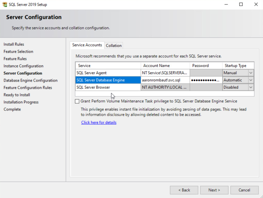 By default, the SQL Server Database Engine service will be configured with NT Service\MSSQLSERVER Account Name.