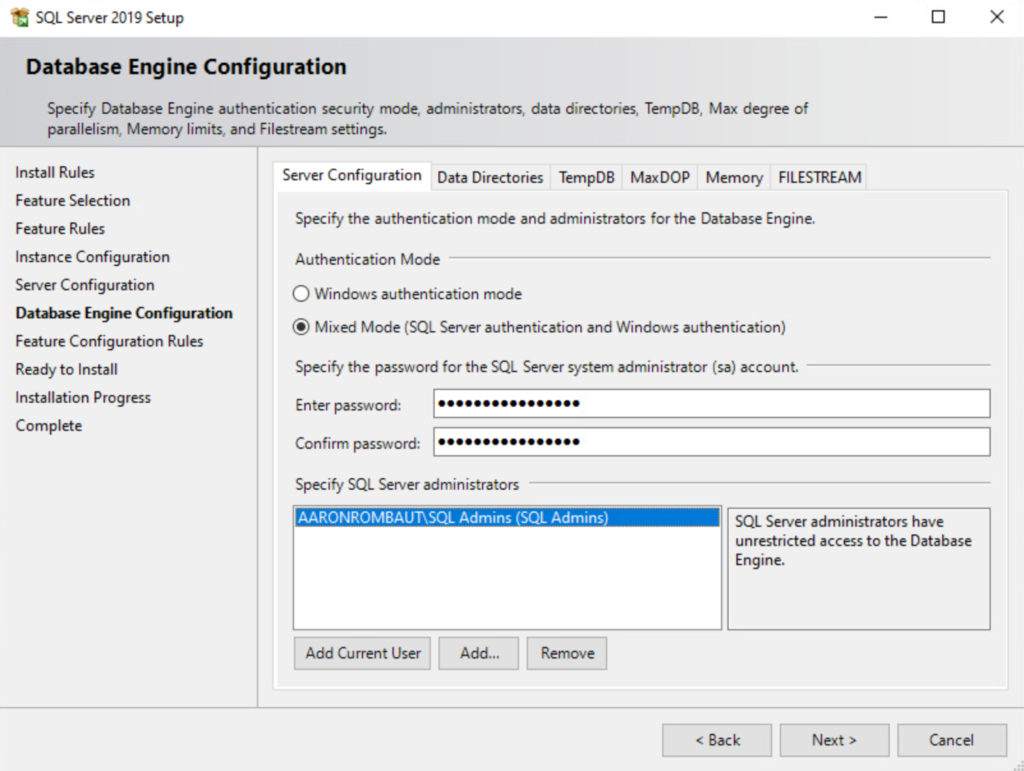 Choose Mixed Mode (this is required because VMware Horizon Events cannot use Windows authentication mode at the time of this writing). This can be configured after SQL Server 2019 Setup completes if it was missed in the past.