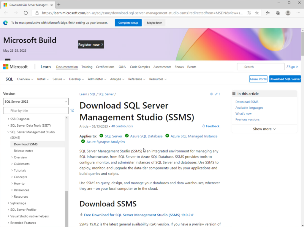 Under the Download SSMS section, click Free Download for SQL Server Management Studio (SSMS).