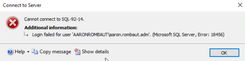 If you forgot to add an admin user to the security group before logging into the Windows Server, add the user to the security group and make sure you log off and back on to the SQL server before trying to log in with SSMS (this is a Windows Security feature and not a flaw of Microsoft SQL Server). Otherwise, the following message will probably display.
