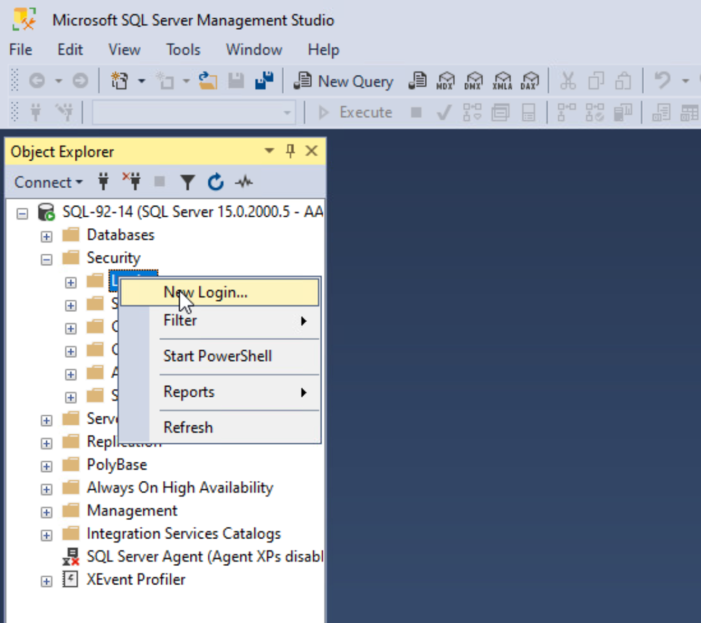 Open Microsoft SQL Server Management Studio (SSMS) and log in to the first SQL Server.