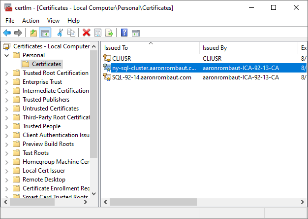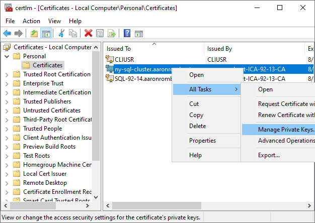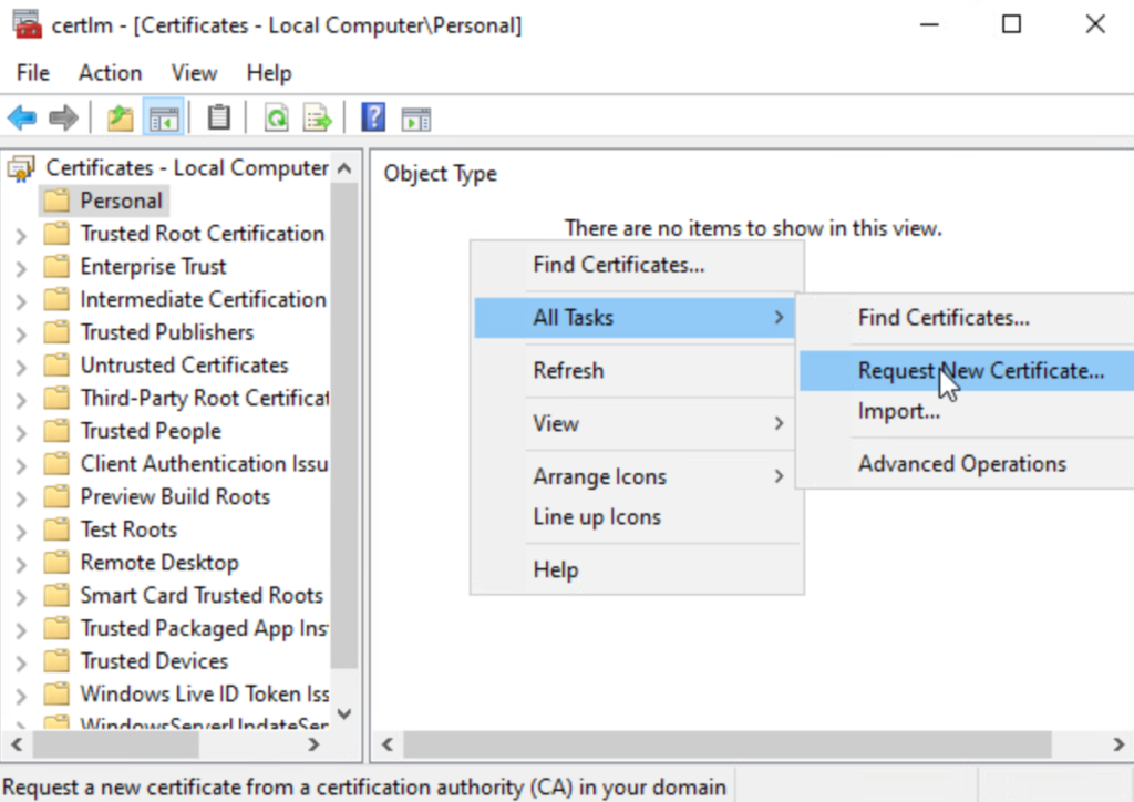 From the SQL Server, open the Local Computer Certificates MMC (certlm.msc) as a user in the Certificate Admins security group (you may have to log into the Windows Server as this user) and expand the Personal store. Right-click in the white-space, expand All Tasks, and choose Request New Certificate…