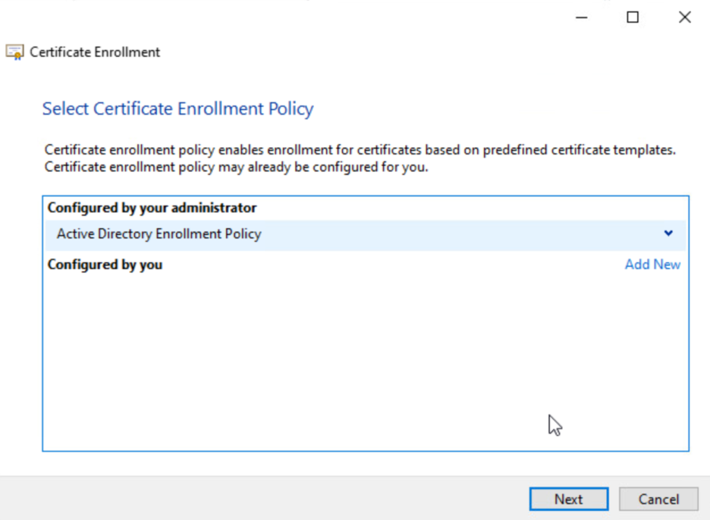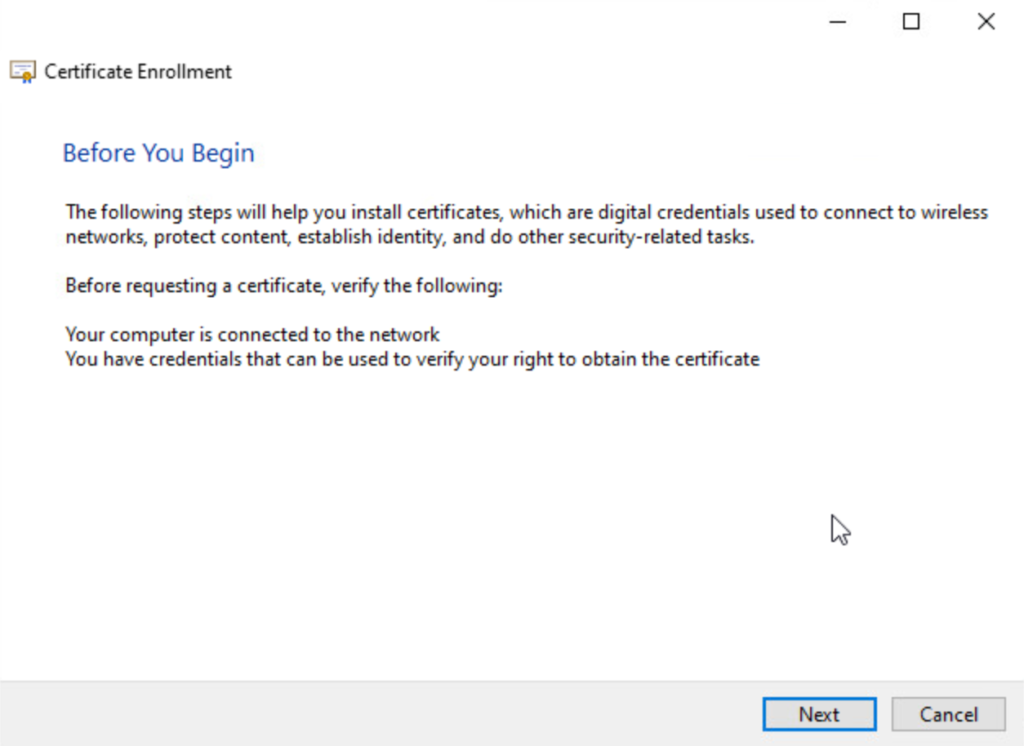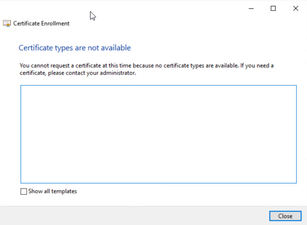 When you get to the screen where certificate templates should be and you do not see any (see below), this is likely a permissions issue. You may be an administrative user, but the certlm.msc is using the account of the computer. The computer, therefore, must have permissions specified on the Certificate template. If you are following along in my blog, a security group was added to the certificate template we need, called Certificate Admins. Make sure the Domain Computers security group is added to this security group and reboot the computer. The reboot will pick up the new security group. Try to issue the certificate again.