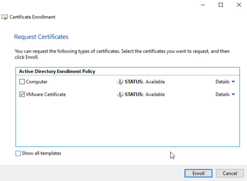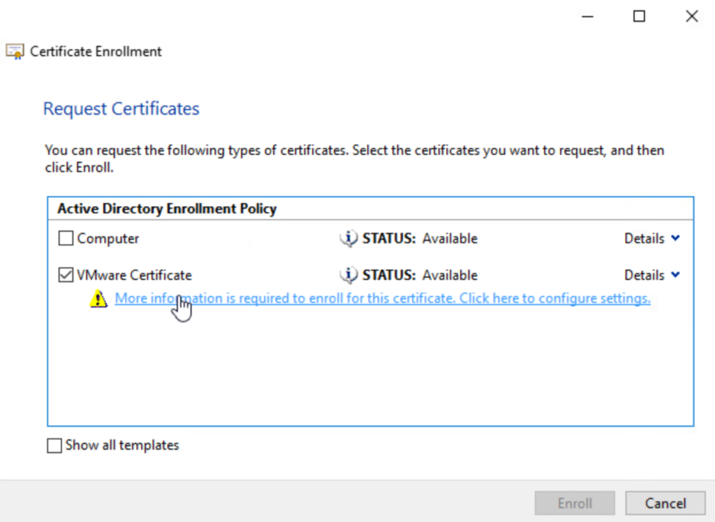 What you should see when the permissions are correct. Even though this is a Microsoft SQL server, the VMware Certificate template will work and should be used, here. Select the checkbox for the certificate and click the lick to start configuring the details.