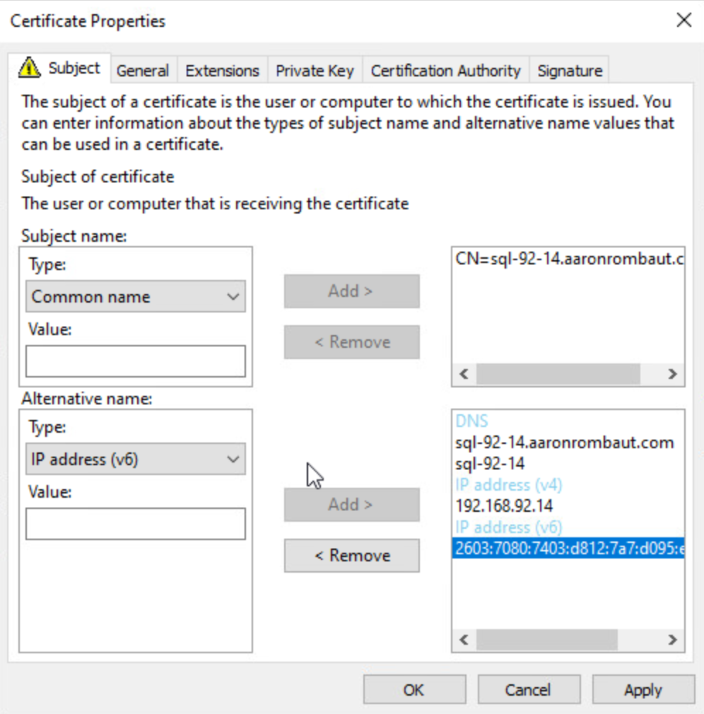 On the Subject tab, add the fully qualified domain name (FQDN) for the Subject name. For the Alternative name (Subject Alternate Name) add the FQDN again. In addition, add the short name and IPv4 and IPv6 addresses. If there are more than one server, add the Virtual IP host name as the Subject name (Common Name) and all the supporting servers in the Alternative name. This ensures that no matter how you connect to the server, it should be able to be securely connected to.