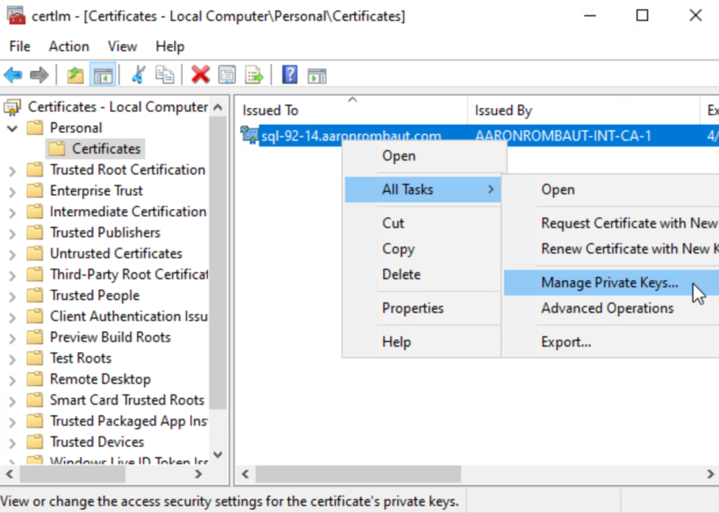 Open the Local Computer Certificate manager (certlm.msc) and expand the Personal store. Find the certificate that was previously requested. Right-click the certificate, expand All Tasks, and click Manage Private Keys…