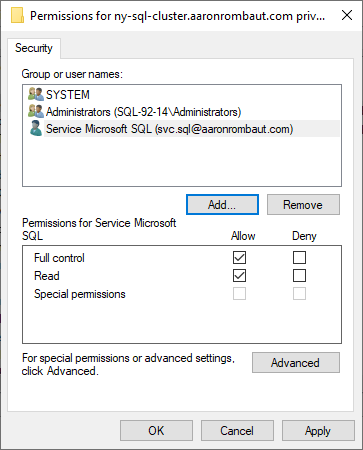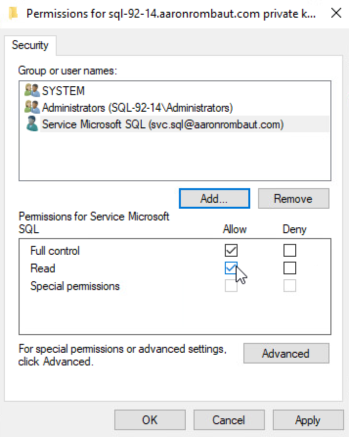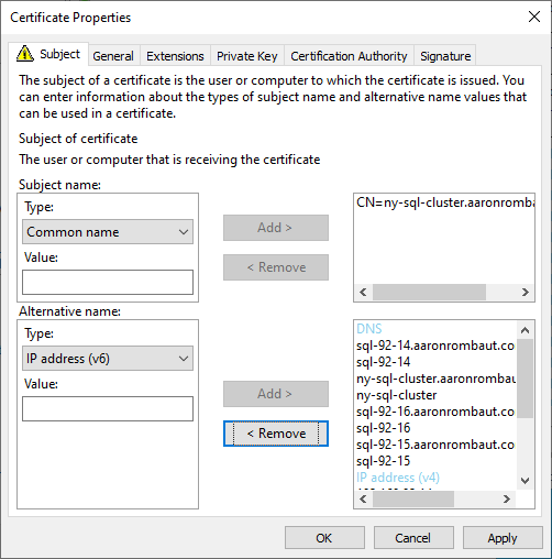 Note: the following section is going to assume that a valid certificate or valid certificates are accessible, either from an internal Certificate Authority (CA) or public CA. There is more information later in this post on how to request a certificate from an internal CA. If planning an Always On Availability Group, make sure the group name is the Common Name (CN) in the certificate and add all the nodes in the cluster to the Subject Alternative Name (SAN).