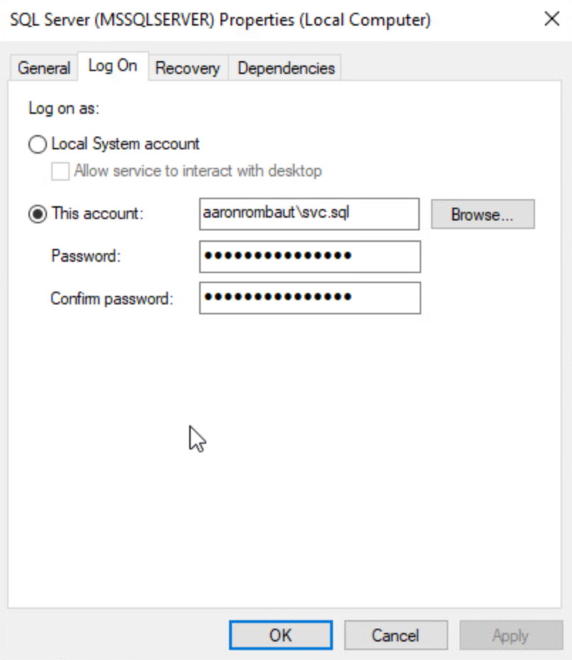 If a service account (i.e. svc.sql) has been configured, which is recommended, this can be configured, here.