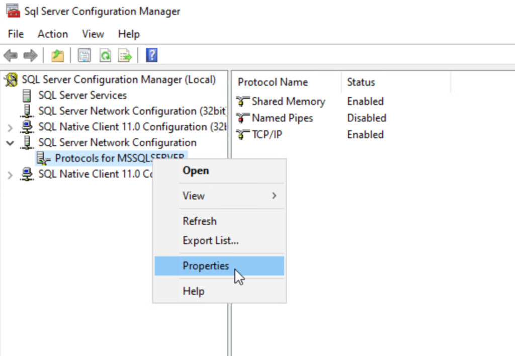 Open Sql Server Configuration Manager and expand SQL Server Network Configuration. Right-click Protocols for MSSQLSERVER (or whatever the Instance name is) and choose Properties.