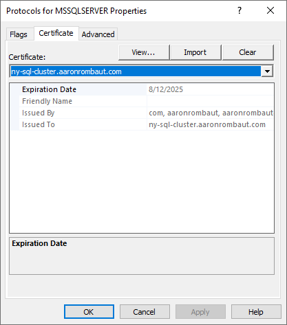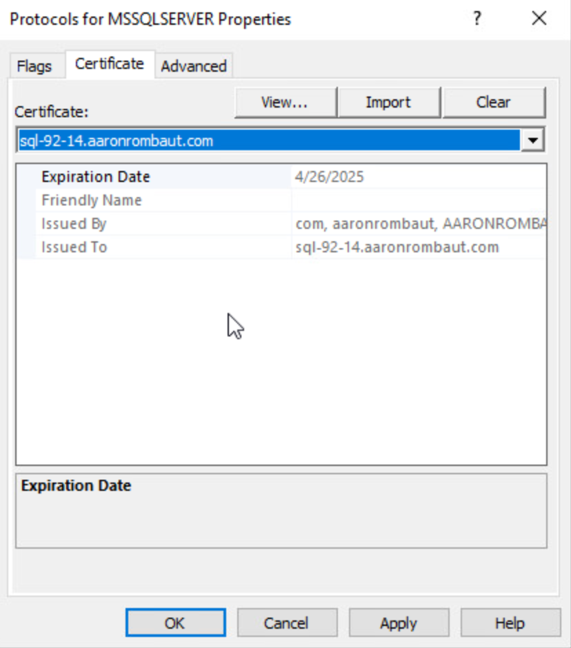 On the Certificate Tab, use the drop down and find the certificate intended on securing the SQL server. Click Apply and OK. You should be prompted to restart the SQL Service so that this takes effect.