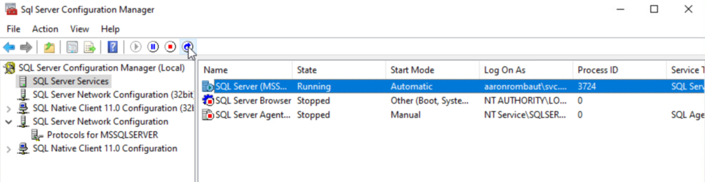 SQL Server Services > SQL Server (MSSQLSERVER) > Restart