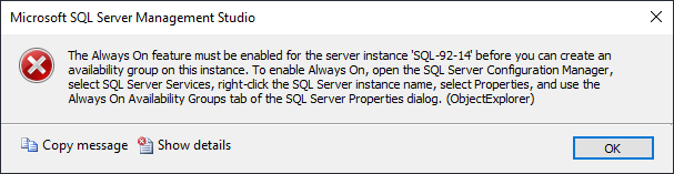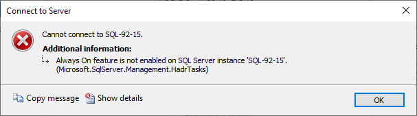 Follow the earlier procedure on the other nodes to enable the Always On feature if the Always On feature is not enabled and the following message is received.
