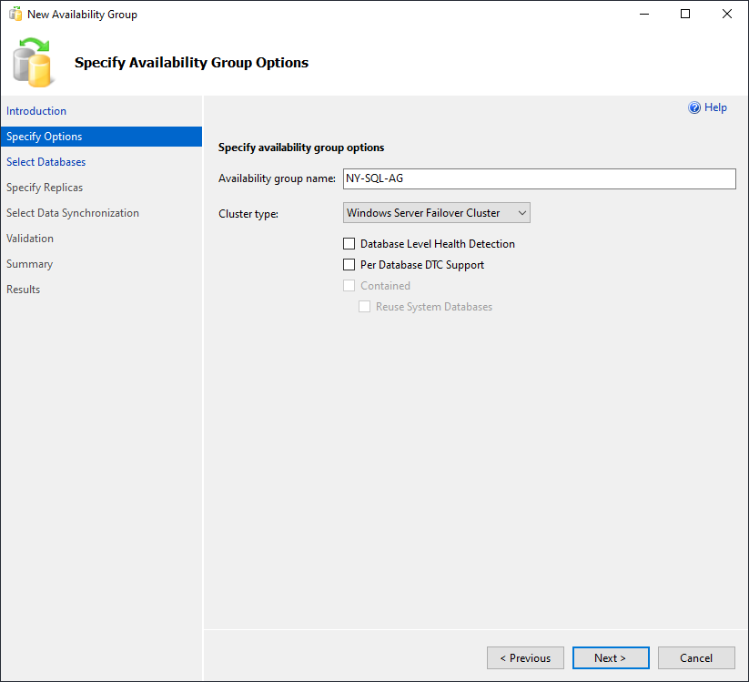 Provide a name for the Availability Group. For the cluster type, ensure Windows Server Failover Cluster is selected. If it is set to EXTERNAL and the Windows Server Failover Cluster is not in the list…