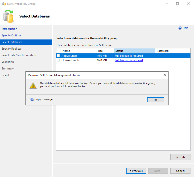 Let’s make the necessary backups. Note this can be done without closing the New Availability Wizard window.