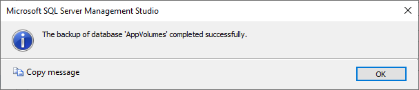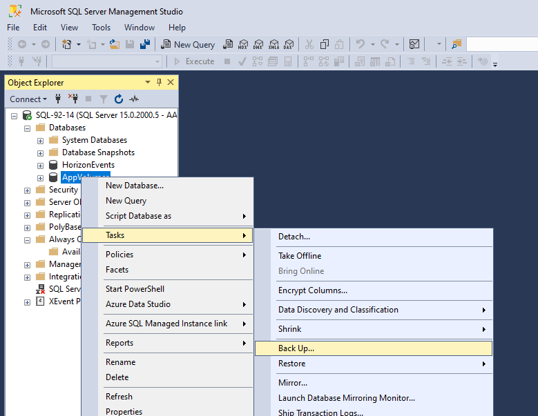Right-click the database, AppVolumes in this case, point to Tasks, then Back Up…
