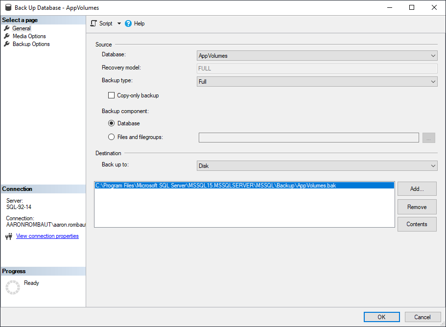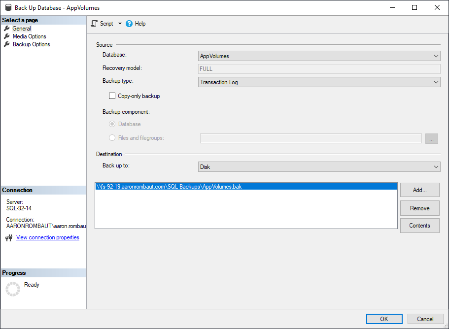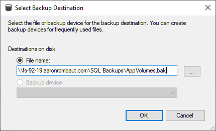 We need to take two backups. This first one will be a Full backup type. I am also going to change the location that I back up to. I want to use a file share that both SQL servers have access to. The screen shot below has the original location, but subsequent screen shots will have the file share location.