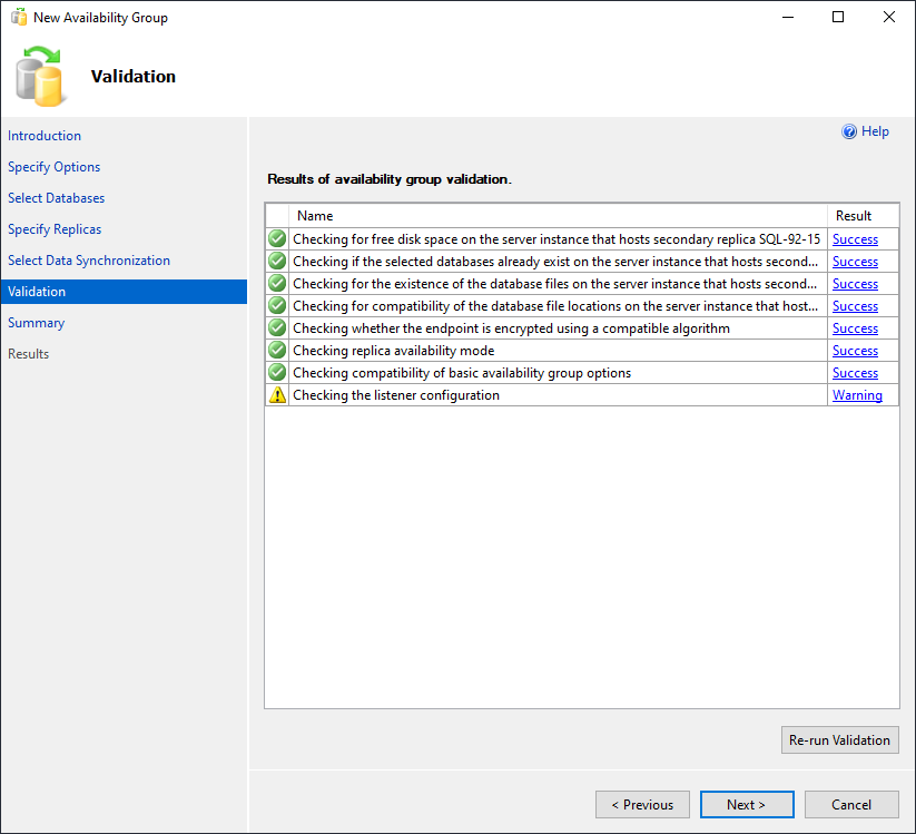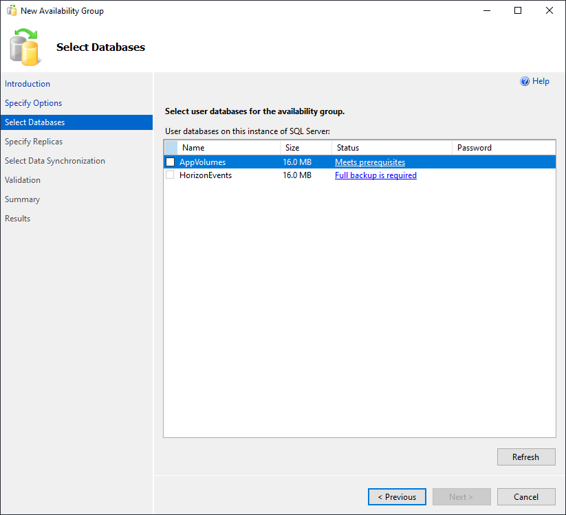 Return to the New Availability Group wizard and click Refresh. Notice the Status now shows Meets prerequisites. Select the database and click Next to continue.