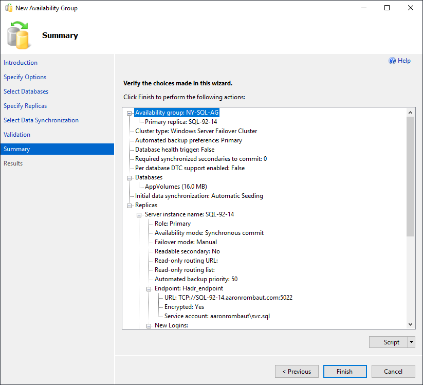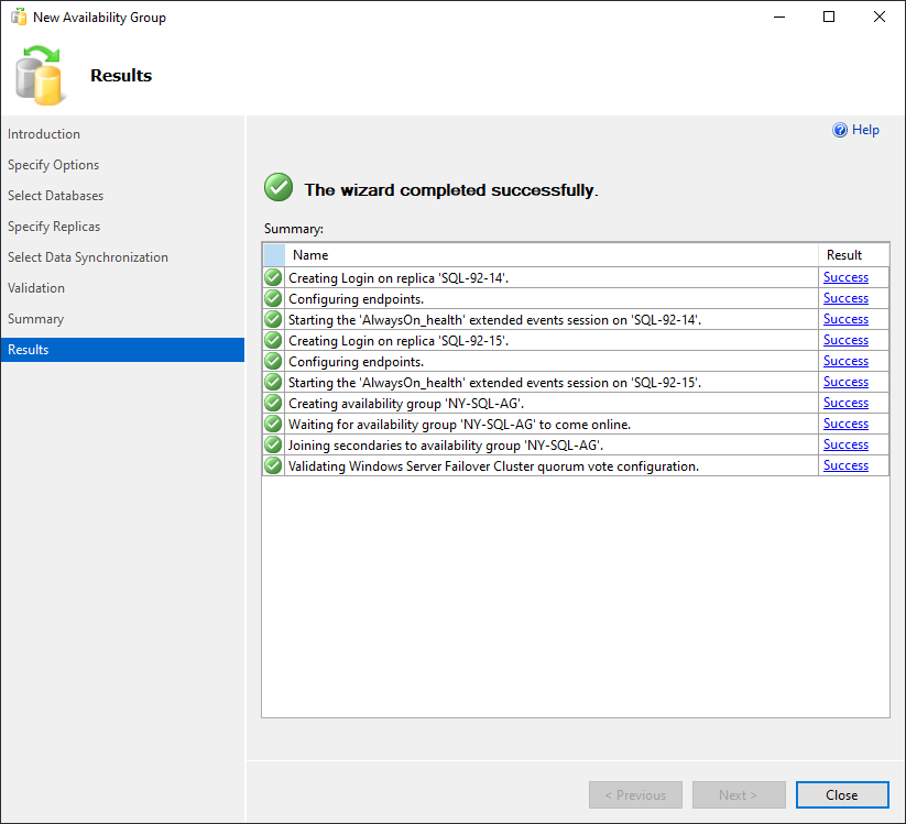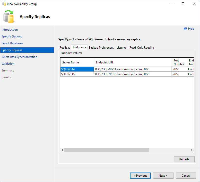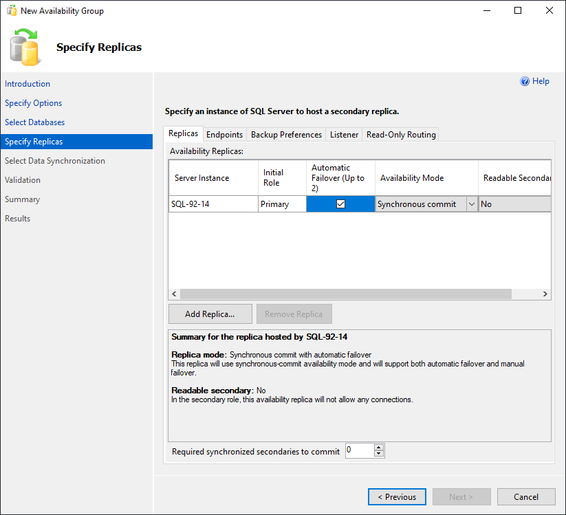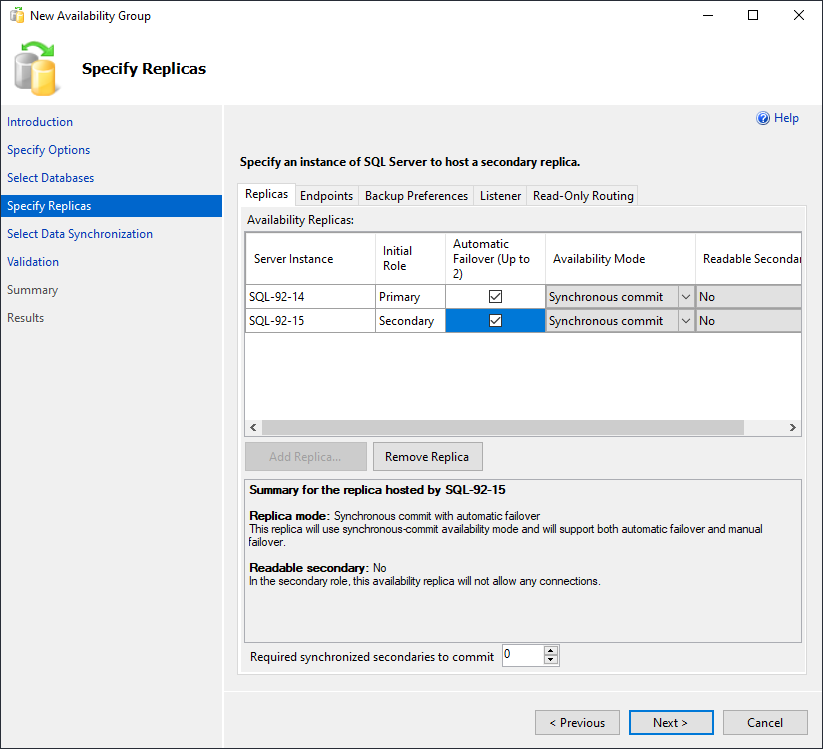 Note that this is not the name that will be used to connect to the SQL service. This name is only naming the SQL Availability Group. The name that was chosen during the Windows Server Failover Cluster wizard is the name that can be used to connect to.