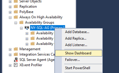 Right-click on the database under the Always On High Availability menu item and choose Show Dashboard. Review the information and make changes if necessary.