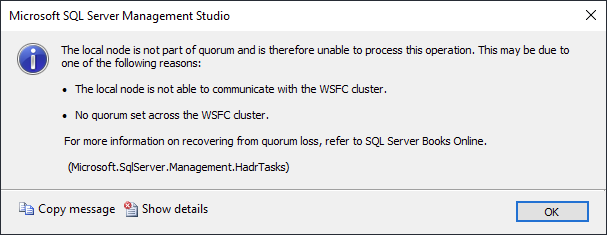 - Ensure two or more Microsoft SQL servers are installed and configured in a Windows Server Failover Cluster (WSFC). Here is a post to assist in setting up a WSFC. The following screenshot shows that this SQL server is not part of a quorum.