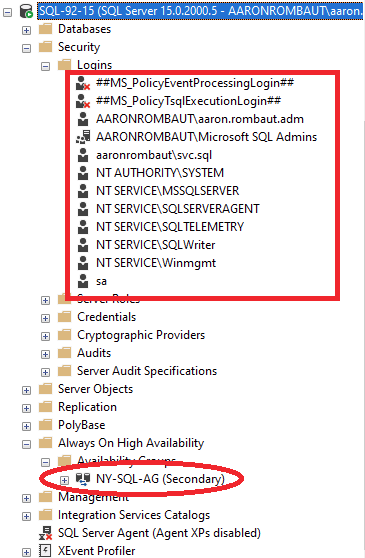 The Secondary in the group will not have active permissions on the objects. The account objects will have to be added to the Secondary node while it is active. This means a failover must take place! Only the Login objects have to be created, though. The database security table will already be aware of the permissions set for the login object, assuming the same object is used. (i.e. AARONROMBAUT\<computer name>$ exists on all Availability Group nodes)