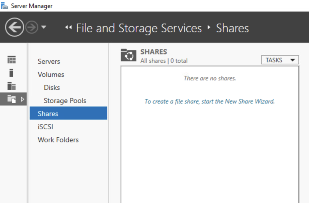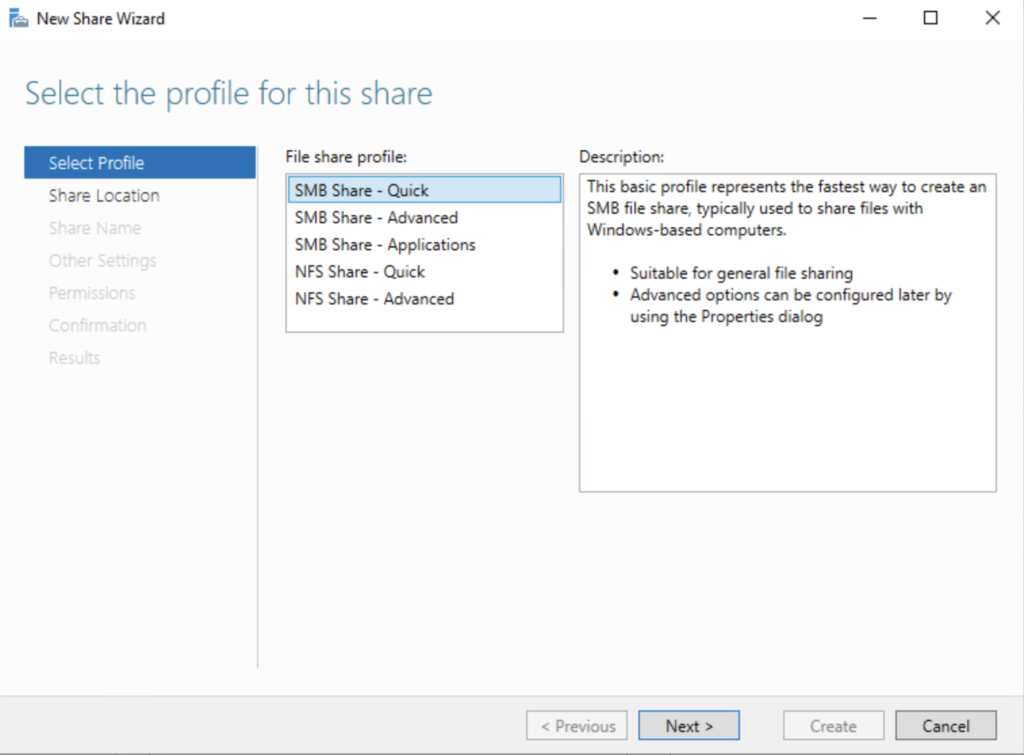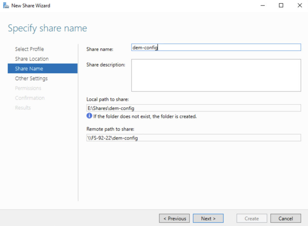 Click To create a file share, start the New Share Wizard. I am going to add three shares right now. One will be for general file sharing in the domain, one will be for VMware Dynamic Endpoint Manager (DEM) Configuration, and the last one will be for end user’s profile data that log into Horizon Desktops using DEM.